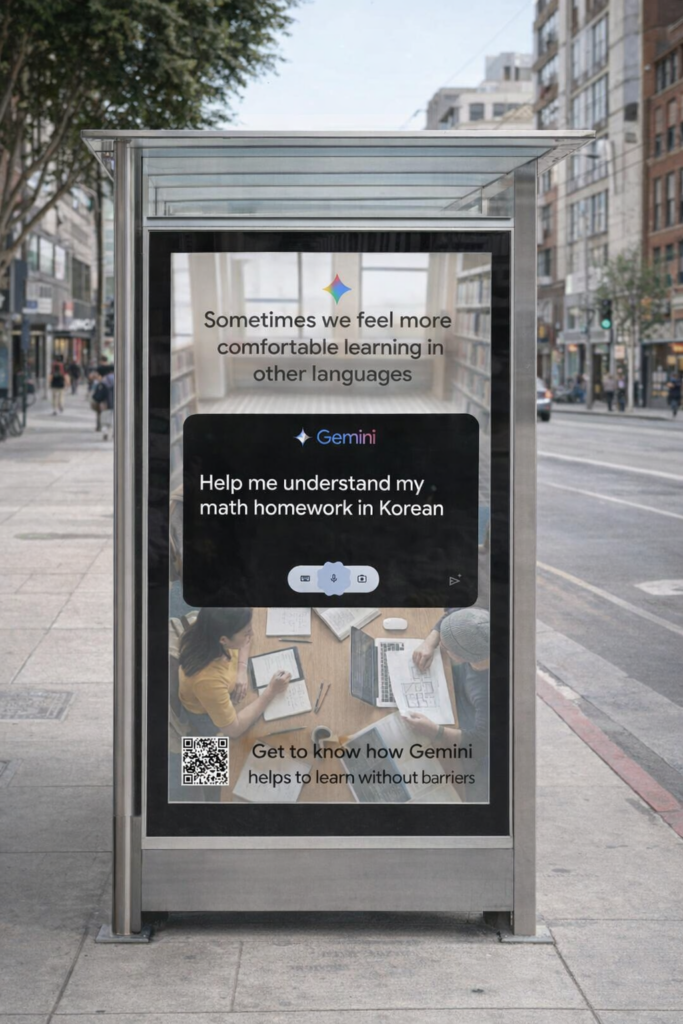 These advertisement mockups were created to promote Gemini’s features for students, educators, and communities, helping them learn across language barriers. Gemini can be used in multiple ways to support learning in the language individuals feel most comfortable with. These advertisements highlight a few examples of how students and teachers can use the platform to solve a single problem—one that can ultimately have a broader impact on many others.