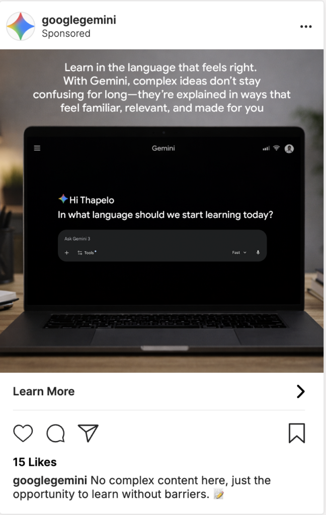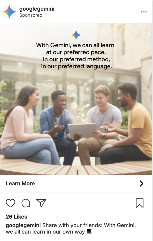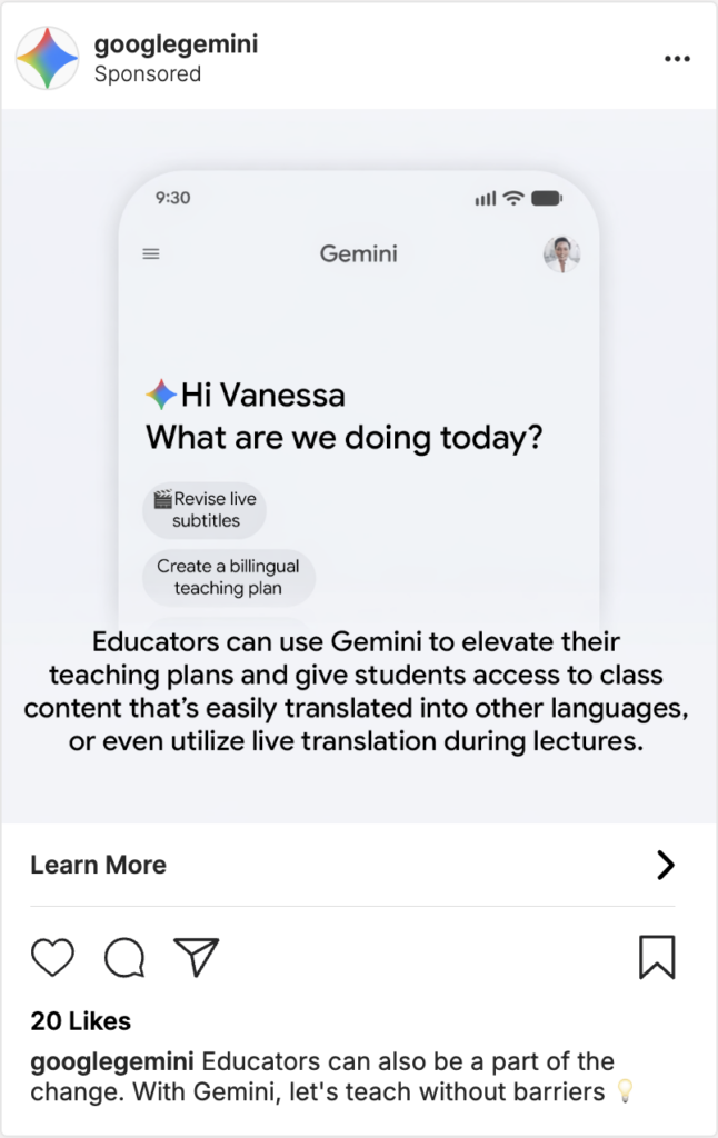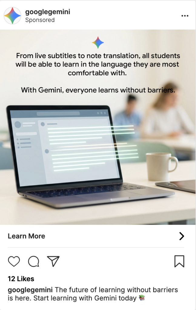Gemini’s Instagram advertisements showcase features designed to eliminate language barriers in education, supporting both students and teachers.